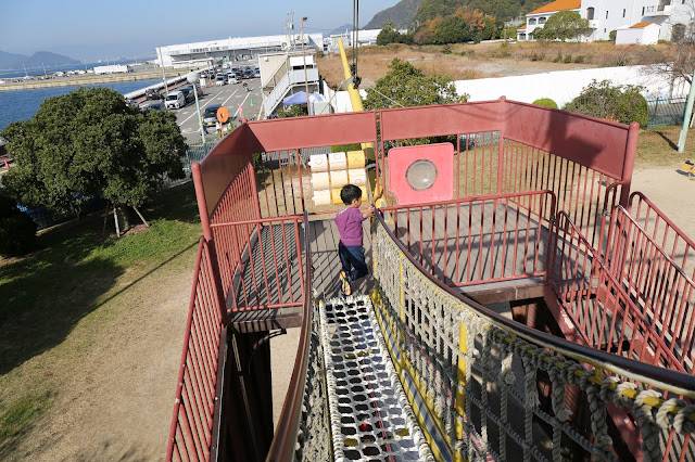 子どもに連れられ遊具に上がると、対岸の能美島が見えるキレイな景色が広がります。